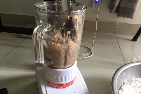– Kế đến bạn chuyển qua làm phần tôm cháy cho cách làm bánh bèo. Tôm mua về bạn tiến hành lột vỏ, chẻ sống lưng lấy bỏ chỉ, rửa sạch rồi để vào rổ. Giữ lại vỏ tôm để làm nước mắm. Bạn cho tôm vào cối giã hoặc dùng máy xay cho thịt tôm mịn ra.
