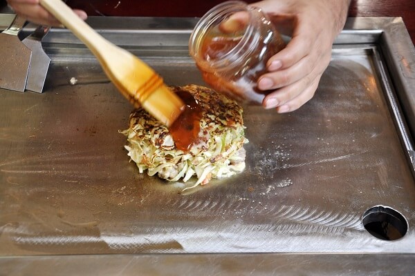 Khi hai mặt bánh đã thật chín vàng và ngả sang màu hơi nâu, bạn lật mặt bánh thêm lần thứ hai, giảm nhiệt độ về mức trung bình thấp cho bánh được chín cả phần bên trong. Khi bánh đã chín thì phết đều nước sốt bánh xèo lên trên mặt bánh, thêm sốt Mayonnaise vaới hành lá thái nhỏ. Rắc đều thêm rong biển vụn Aonori lên trên và cuối cùng bạn thêm cá bào sợi to.