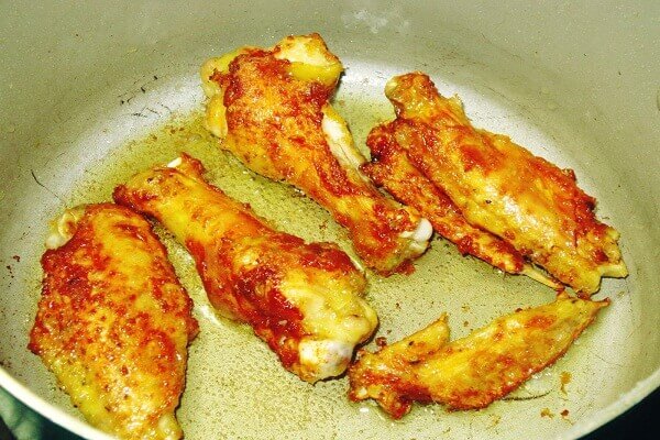 Sau khi cánh gà được chiên hết. Bạn cho số nước sốt cay lên chảo đun nóng lại, rồi cho hết phần cánh gà vào trộn đều để cánh gà thấm hết sốt cay.