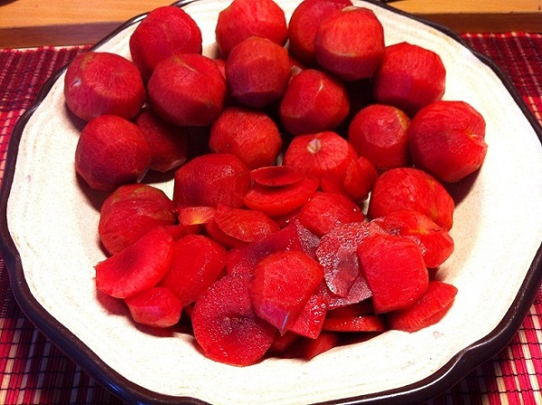 · Bạn mua mận đỏ về, sau đó rửa sạch bằng nước rồi gọt bỏ đi phần vỏ.