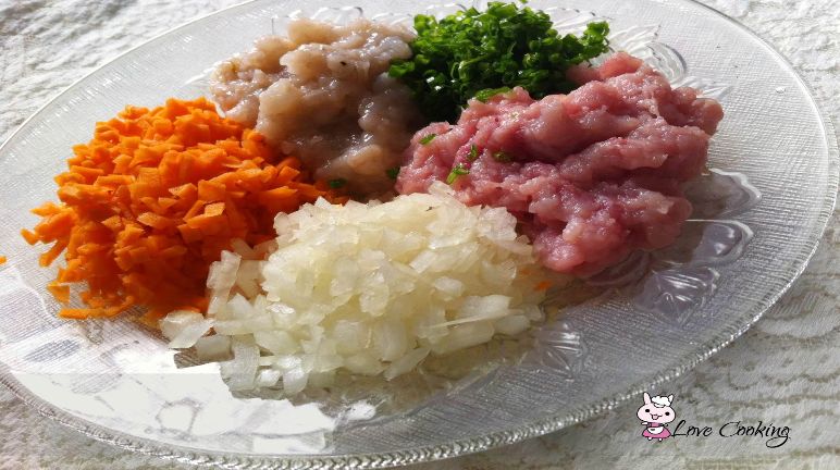 Sơ chế tôn, bóc lấy phần thịt tôm và xắt nhỏ. Cho hành khô vào chảo và phi cho thơm. Cẩn thận cho tôm vào xào với ít nước mắm cho đến khi thơm và đậm đà. Sau khi hoàn thành bạn đã có thể đem phần tôm xào trộn đều cùng thịt băm, nấm hương, mộc nhĩ, hành lá, ít hạt nêm và hạt tiêu. Cho đến bạn thấy nhân đã ráo nước thì bắt đầu tắt bếp để nguội.