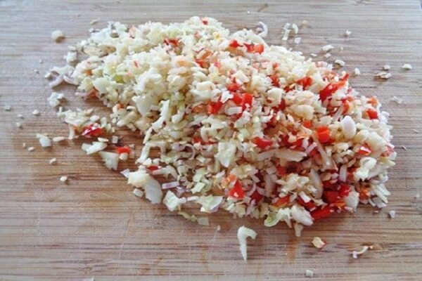 – Sau khi đã chiên xong há cảo bạn sẽ tiến hành cách làm nước chấm há cảo. Bạn bóc vỏ tỏi, rồi sau đó đem băm thật nhỏ tỏi và ớt, nếu bạn không ăn được cay thì không cần cho ớt hoặc cho ít ớt lại là được, băm xong bạn cho vào tô.