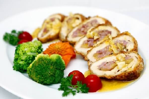 – Xếp gà cuộn phô mai ra dĩa có trang trí sẵn hoa cà chua để cho món ăn thêm phần bắt mắt. Có thể ăn kèm thịt với khoai tây nghiền và sốt mù tạt, sẽ đem đến một hương vị vô cùng mới lạ, hấp dẫn.