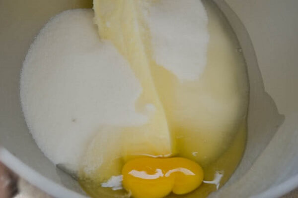 – Trong một cái tô sạch, các bạn cho bơ và đường kính vào tô. Dùng phới đánh trứng bạn đánh tan hỗn hợp này.
