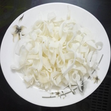 Do cơm dừa non hơi mềm, bạn nên nạo mứt dừa nhẹ nhàng thành dạng sợi. Để được sợi dừa dài bạn có thể nạo theo vòng quanh cơm dừa bằng dao hai lưỡi, so với sợi dừa loại dừa bánh tẻ sẽ dầy hơn 1 chút thì khi ăn mứt dừa sẽ mềm và dẻo.