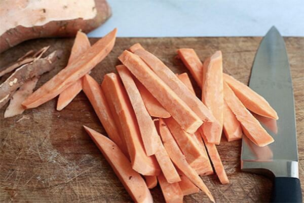 Bước 1: Đầu tiên, khoai lang gọt bỏ vỏ, rửa sạch, đem cắt miếng dài vuông bằng ngón tay.