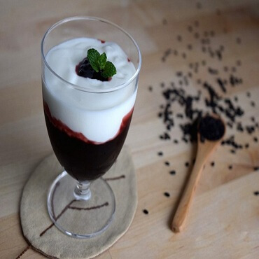 – Khi chè nếp cẩm đã nguội, bạn múc chè nếp cẩm ra một cái cốc hoặc chén. Sau đó cho sữa chua, nước cốt dừa và ít đá vào trong cốc rồi có thể thưởng thức được luôn món sữa chua nếp cẩm do tự tay mình làm.