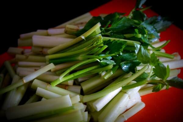 – Hành tây bạn lột vỏ, rửa sạch, cắt miếng múi cau, tách rời từng miếng hành tây. Dứa gọt vỏ, bỏ mắt, cắt miếng vừa ăn, trộn với ½ muỗng đường. Rau cần nhặt vừa rửa sạch, cắt khúc dài 3cm.