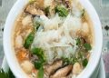 Bước 6: Múc chén súp ra tô, cho thêm trứng bắc thảo và trứng cút nếu thích. Rắc tiêu, hành ngò và một ít hành phi, nêm thêm 1 ít dầu mè và nước tương tùy khẩu vị.