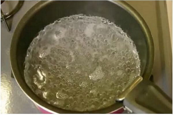 Bước 1: Ngâm riêng 1 phần bột rau câu với nước trong tầm 30 phút rồi bạn cho vào nồi nấu đến khi sôi, chú ý nhớ khuấy đều tay để rau câu không bị bén ở đáy nồi nhé